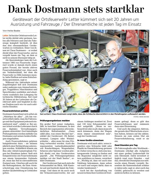 Die HAZ erstellt zurzeit Artikel über Kameraden der einzelnen Ortsfeuerwehr. Von uns hat unser Gerätewart Claus Dostmann einen Artikel bekommen.…